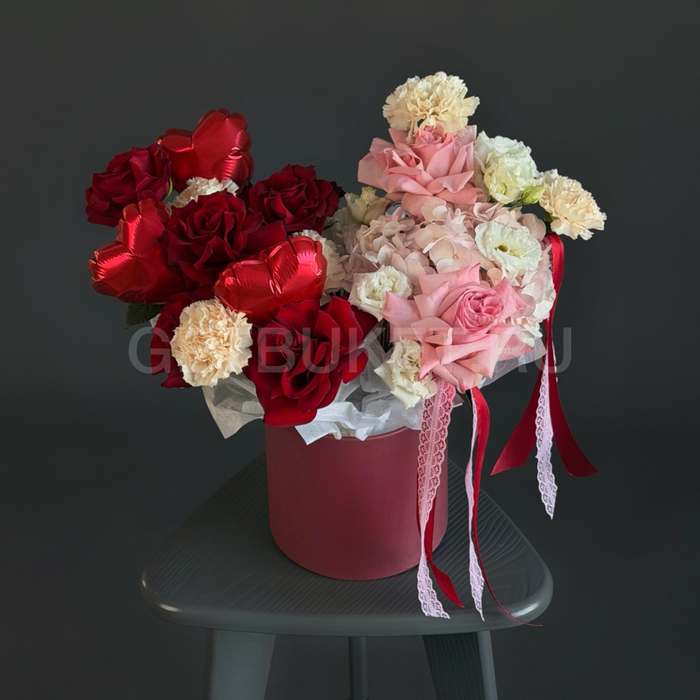 Цветочная композиция из микса красно-розовых роз с гортензией