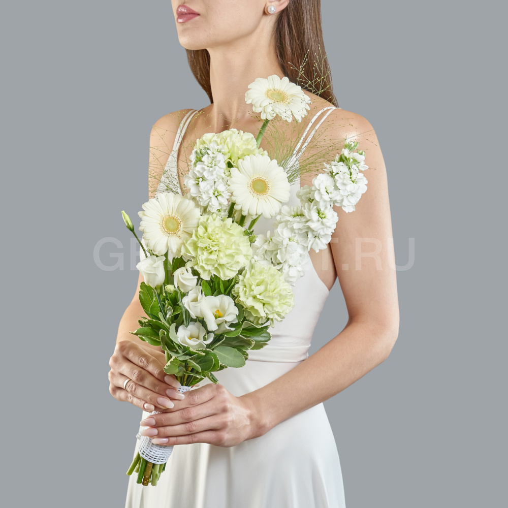 Букет невесты из зеленых гвоздик, гербер и маттиолы