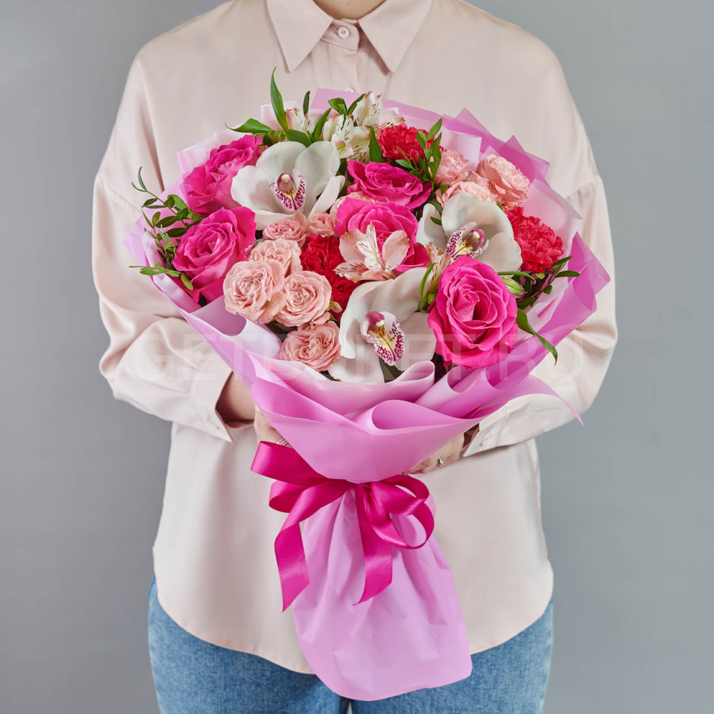 Букет из малиновых роз, орхидей и альстромерий