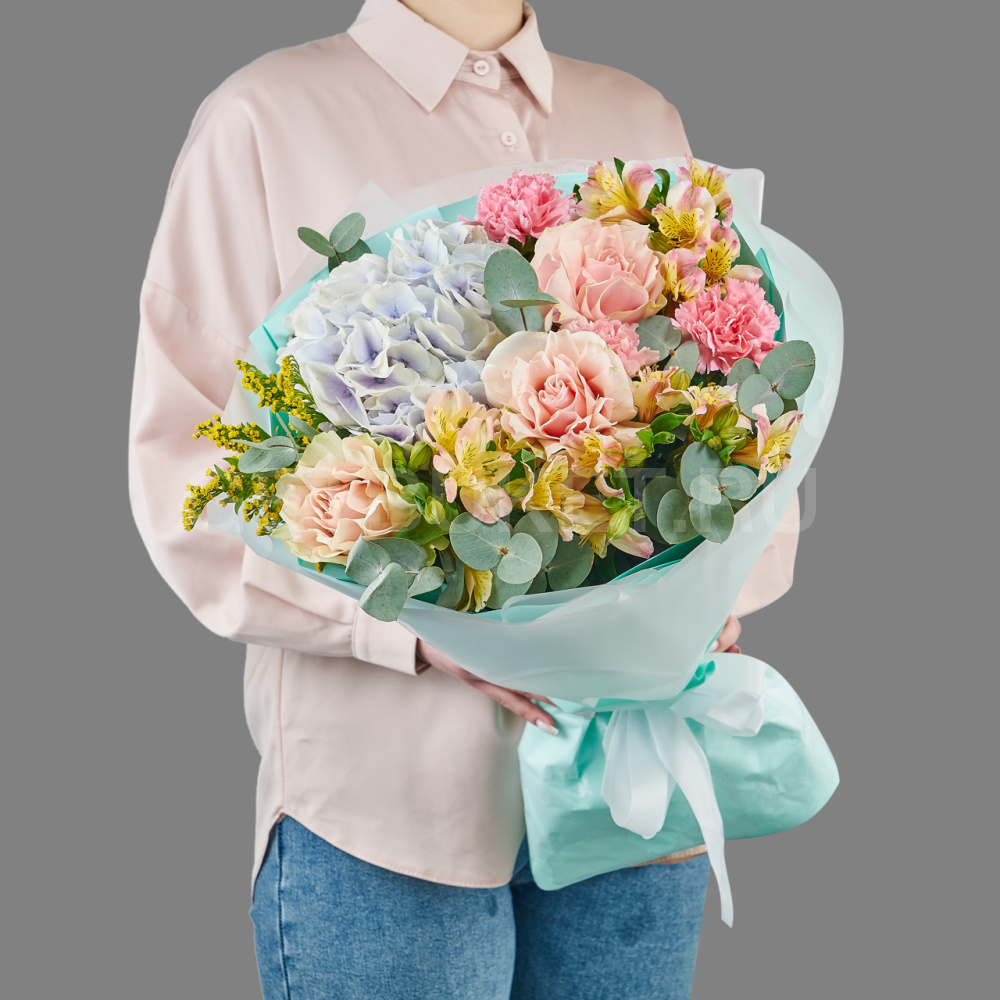 Букет с гортензией, розой и альстромерией