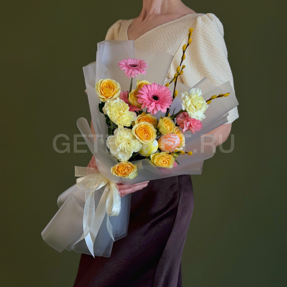Пасхальный букет из гвоздик, кустовых роз и гербер с вербой
