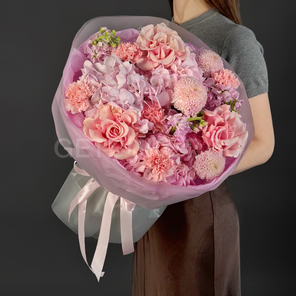 Букет из роз, гвоздик и розовой гортензии с эустомой20 850 ₽Букет из роз, гвоздик и розовой гортензии с эустомой 20 850 ₽ -