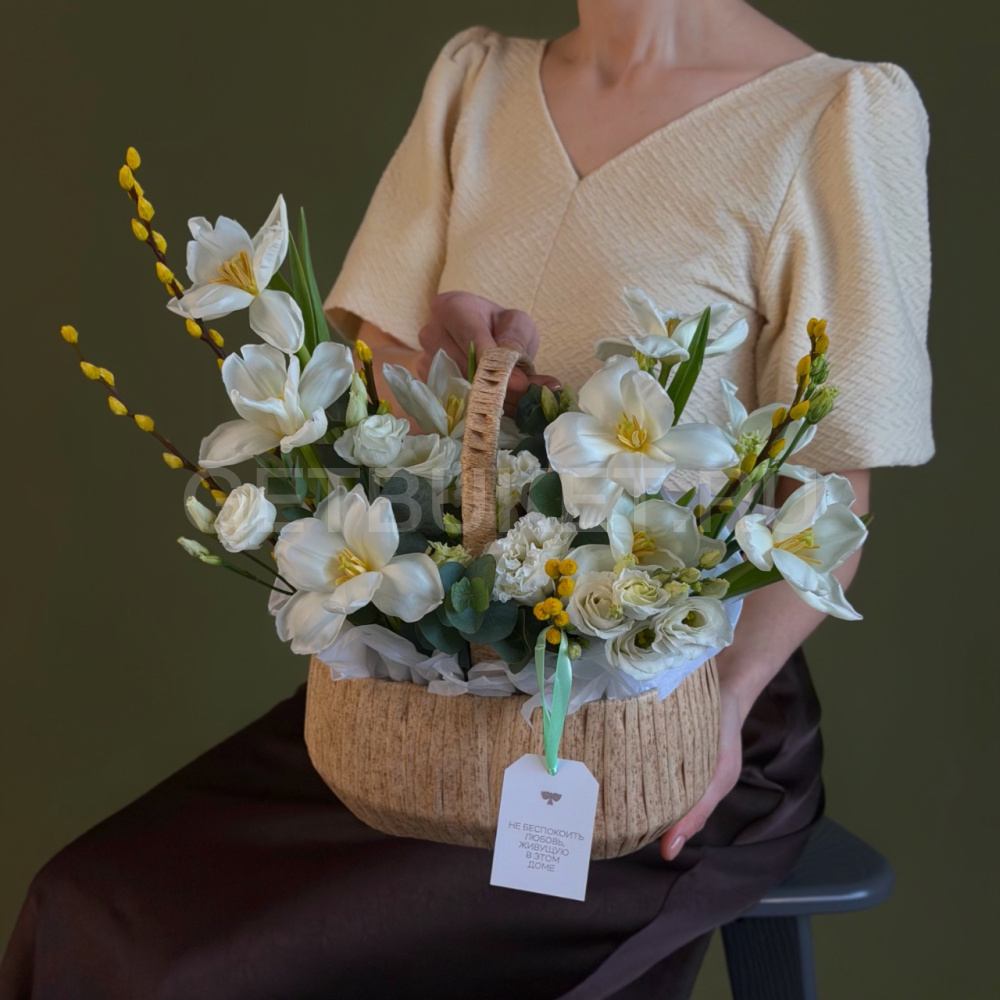Цветочная композиция с тюльпанами, эустомой и вербой в корзине