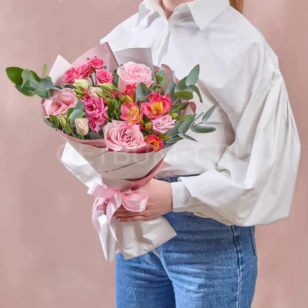 Букет из розовых гвоздик, роз и альстромерий4 070 ₽Букет из розовых гвоздик, роз и альстромерий 4 070 ₽ -