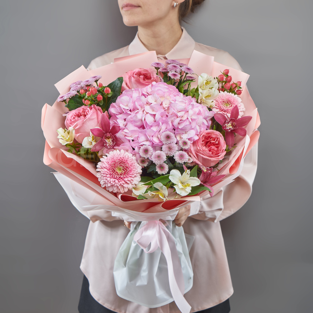 Букет из роз, гвоздик и розовой гортензии с эустомой20 850 ₽Букет из роз, гвоздик и розовой гортензии с эустомой 20 850 ₽ -