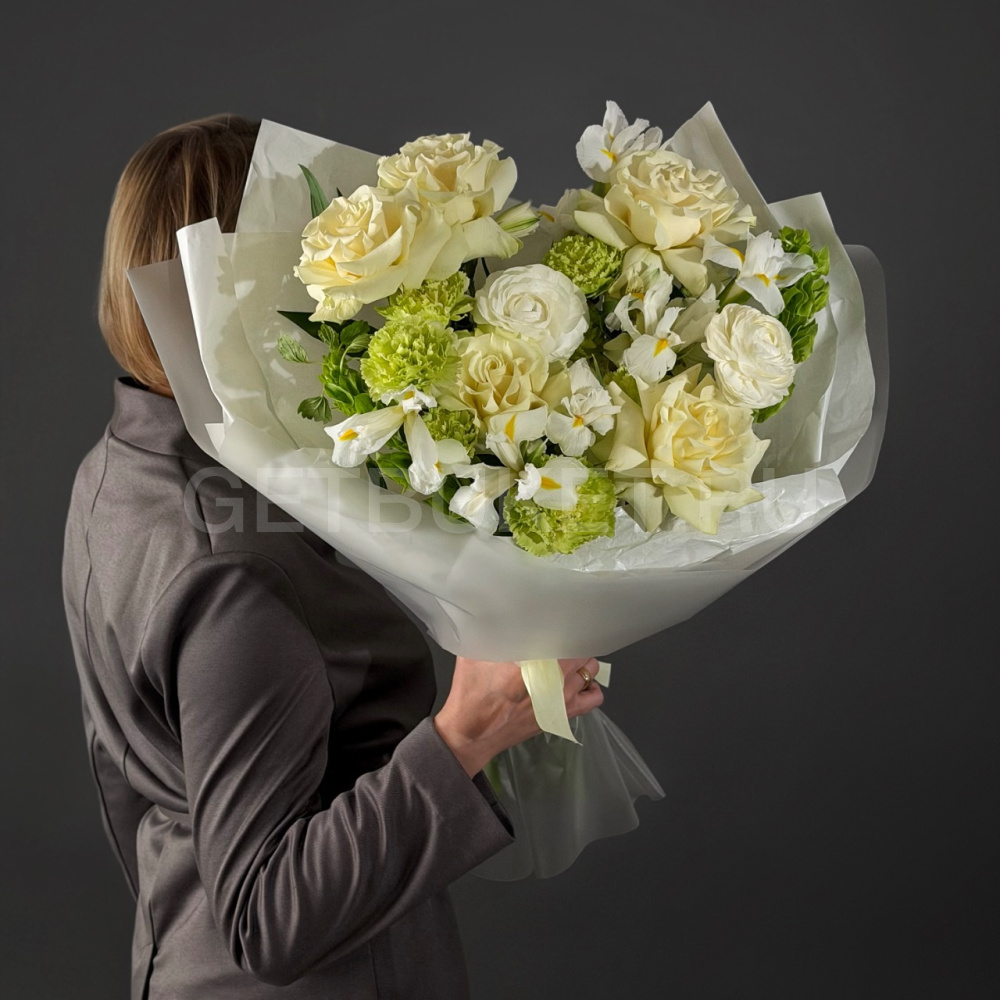 Букет из роз, молюцеллы и ирисов